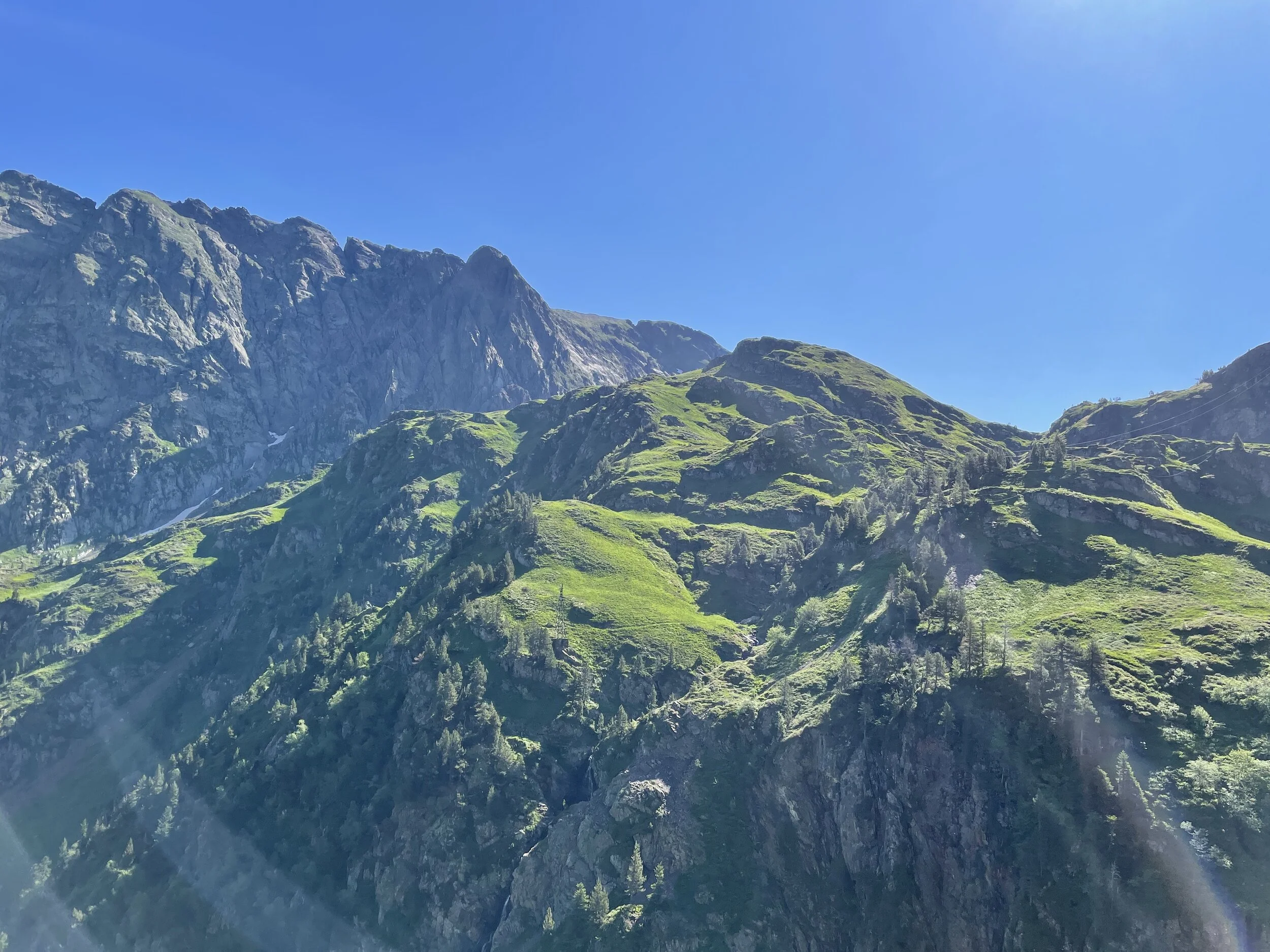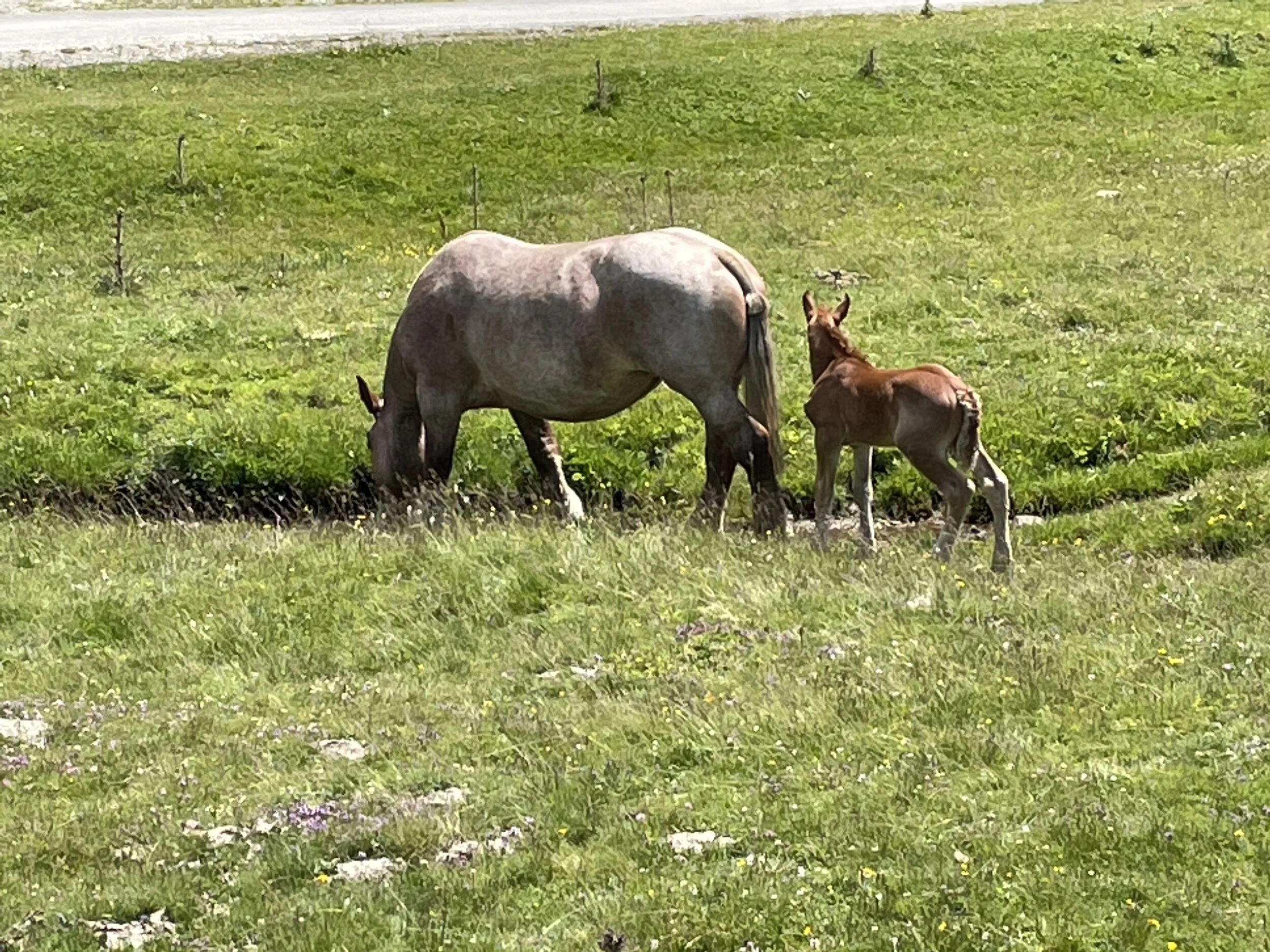 Next up was a runnable, gradual uphill across a grassy field with horses all around us. I bumped into a runner here from Northern Ireland and stayed with him for a bit. I hadn’t come across a single English speaker yet, so it was great to get some company and chat with someone! He was running TDS (sister race of UTMB), and we passed a few miles together.